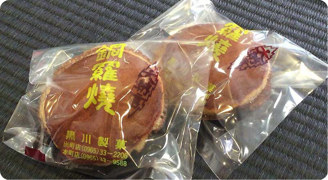 また、黒川製菓の銅羅焼き(どら焼き)が、私のお気に入りです!ふんわり焼き上げた生地と甘さ控えめの粒あんが特徴で、地元八代で長く愛されています。手のひらサイズで食べやすく、ちょっとしたおやつにぴったりなのが一押しポイントです!