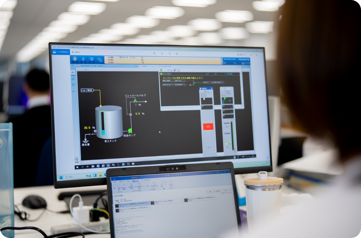 私が特に面白いと感じているのは、計装設計の中で自らプログラミングに携われる点です。「どう制御すれば狙い通りに動くか」を考えながら設計していく工程は、プログラミング好きの私にとって非常に魅力的な時間です。例えば、紙を抄く前の液体状の原料であるパルプの濃度を調整する制御システムを構築した際、DCSに組み込むプログラムを試行錯誤しながら考え、最終的に形にしたことがありました。自分で手を動かしたプログラムで思い描いた通りの制御が実現できたときには、大きな満足感が得られました。