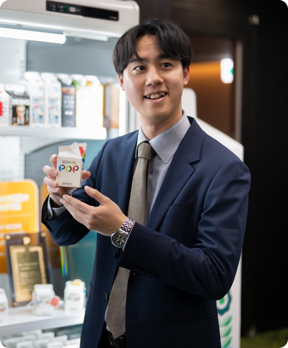 脱プラスチックの流れが加速する中で、大手乳業メーカーを担当していた際に、学校給食向けストローレス紙容器「School POP®」の採用に関わりました。ストローを使わずに直飲みしやすくするため、屋根型容器の形状を工夫し、「飲みやすさ」と「プラスチック使用量削減」という二つの価値の両立を客先へ訴求しました。提案にあたっては、生産工場、開発部門、品質保証部門と連携しながら、客先工場での充填機通機検証(実際の製造ラインでの量産テスト)を重ねました。多くの時間と労力を要しましたが、関係部署と一つずつ壁を乗り越え、最終的に採用が決まった瞬間は、これまでにない達成感を味わいました。