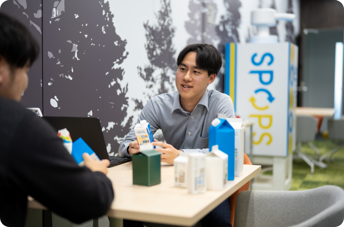 日本製紙の強みである、紙パック・充填機・メンテナンスを三位一体で提供するシステム販売を強みに、より多くの乳業メーカーのお客さまに貢献したいと考えています。単に新しい紙パックを提案するだけでなく、脱プラスチックやSDGsといった社会的課題に対して、紙パックの軽量化による原紙使用量の削減や輸送効率の向上など、お客さまのメリットと環境配慮を両立させる提案ができる営業担当を目指します。