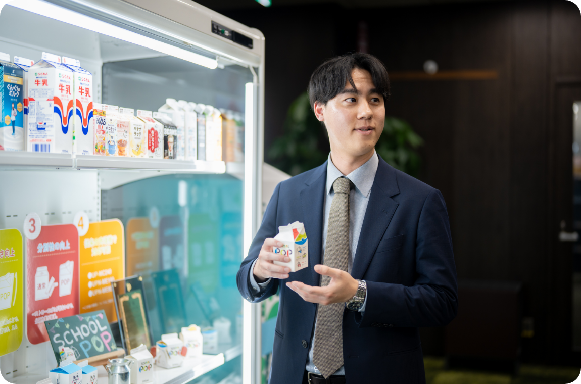 入社以来、液体用紙容器(紙パック)事業に携わり、中小・中堅から大手までさまざまな乳業メーカーを担当しています。既存商品を販売するだけでなく、客先訪問を通じて、お客さまが抱える課題、要望を聞いたうえで課題解決を図る提案型の営業が中心です。日本製紙の営業の特徴は、ずばり提案力だと思います。「紙でできることは紙で」をモットーに紙容器の可能性を追求し、競合他社にない製品の提案を目指します。また、紙パックと充填機を一体で提供することで、お客さまに高品質な紙容器を安定して供給できる体制を実現し、長期にわたり信頼関係を構築しています。