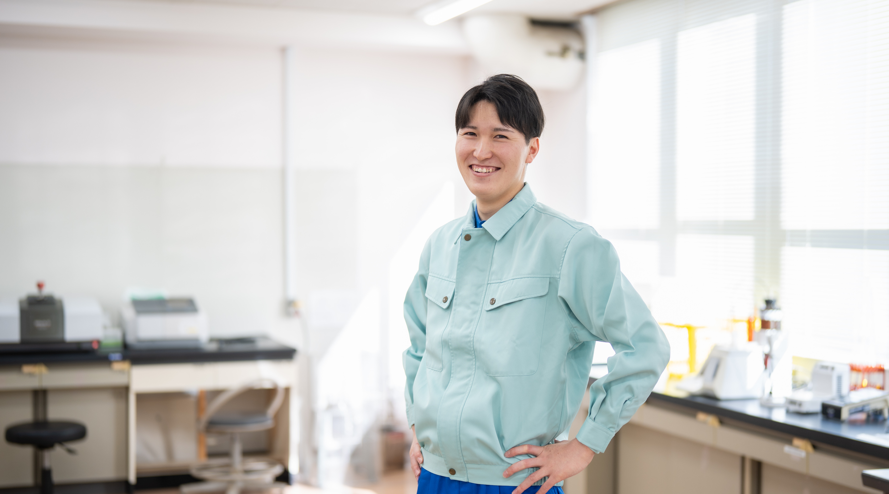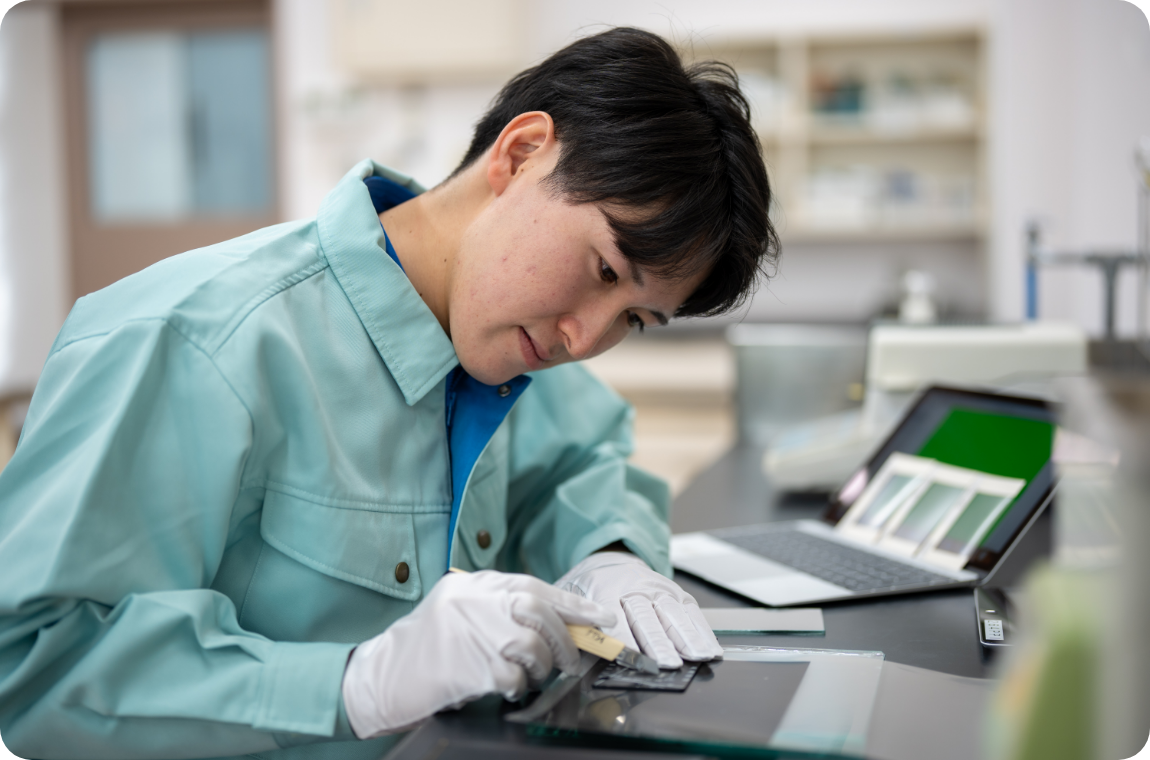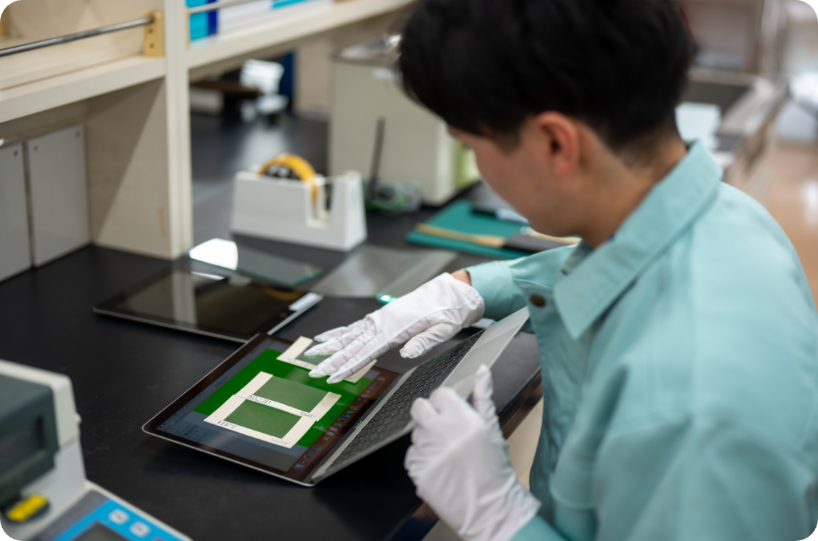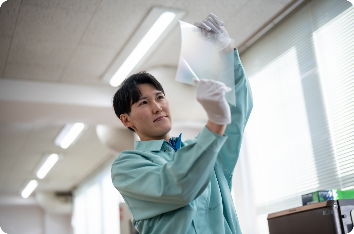 研究者は、日々触れるものすべてが新鮮で、新しい学びにあふれている仕事です。私の場合、化学物質の調合だけでなく、フィルムの硬さや強さといった物理特性、光の透過性や見え方といった光学特性など、これまで学んだ分野とは異なる知識や技術に次々と触れることができます。特に興味深いのは、スマートフォンやパソコンの画面といった、普段は何気なく見ているものの“裏側”を知れること。光のにごり具合(ヘイズ)や透過する光の色味、目に優しい表示を実現するための工夫など、画面の見やすさ一つにも多くの技術要素が詰まっていて、とても好奇心が刺激されます。